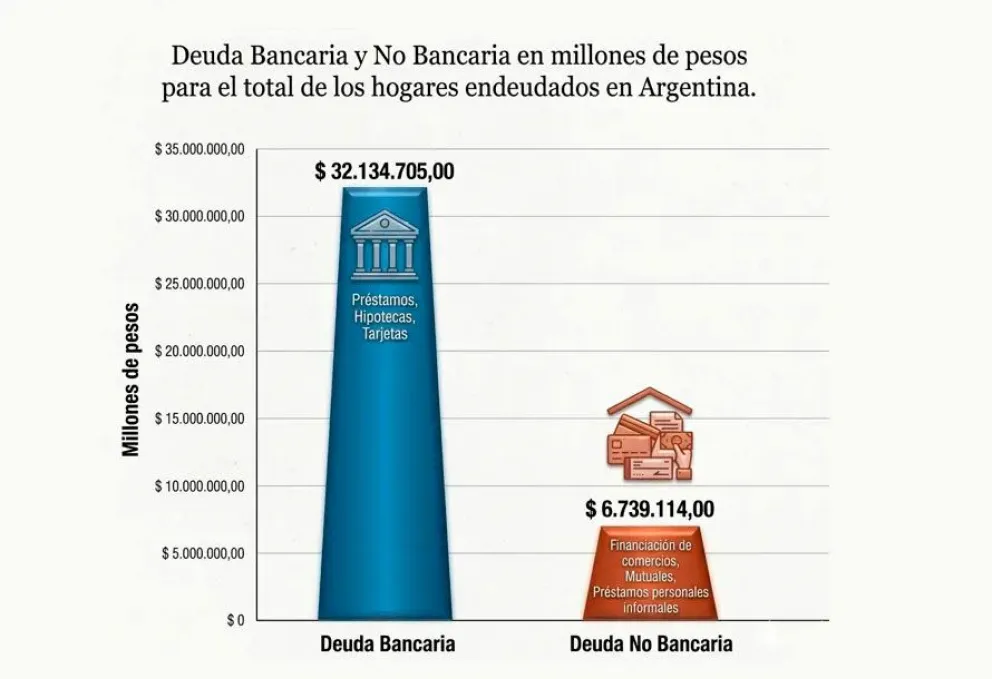En términos de volumen, la deuda bancaria alcanza los $32,1 billones, con un promedio de $5,7 millones por hogar endeudado, mientras que la no bancaria suma $6,9 billones, con montos significativamente menores.