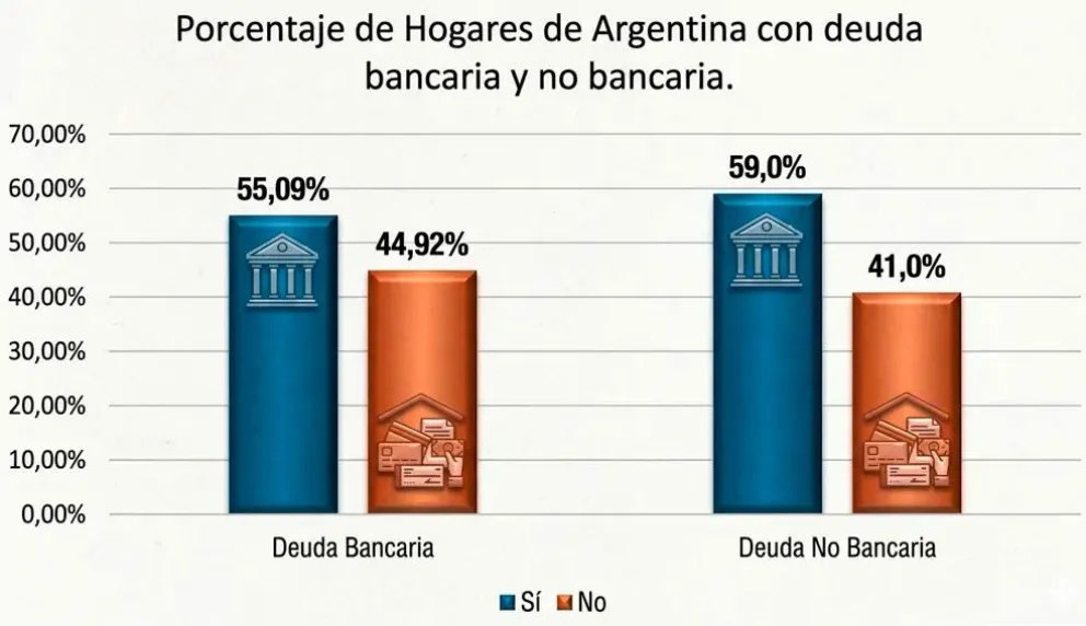 Actualmente, el 55,1% de los hogares tiene deuda bancaria y el 59% mantiene deuda no bancaria, cuando tres años atrás la diferencia superaba los 40 puntos porcentuales. Esta convergencia refleja un corrimiento desde el financiamiento informal hacia el sistema financiero formal.